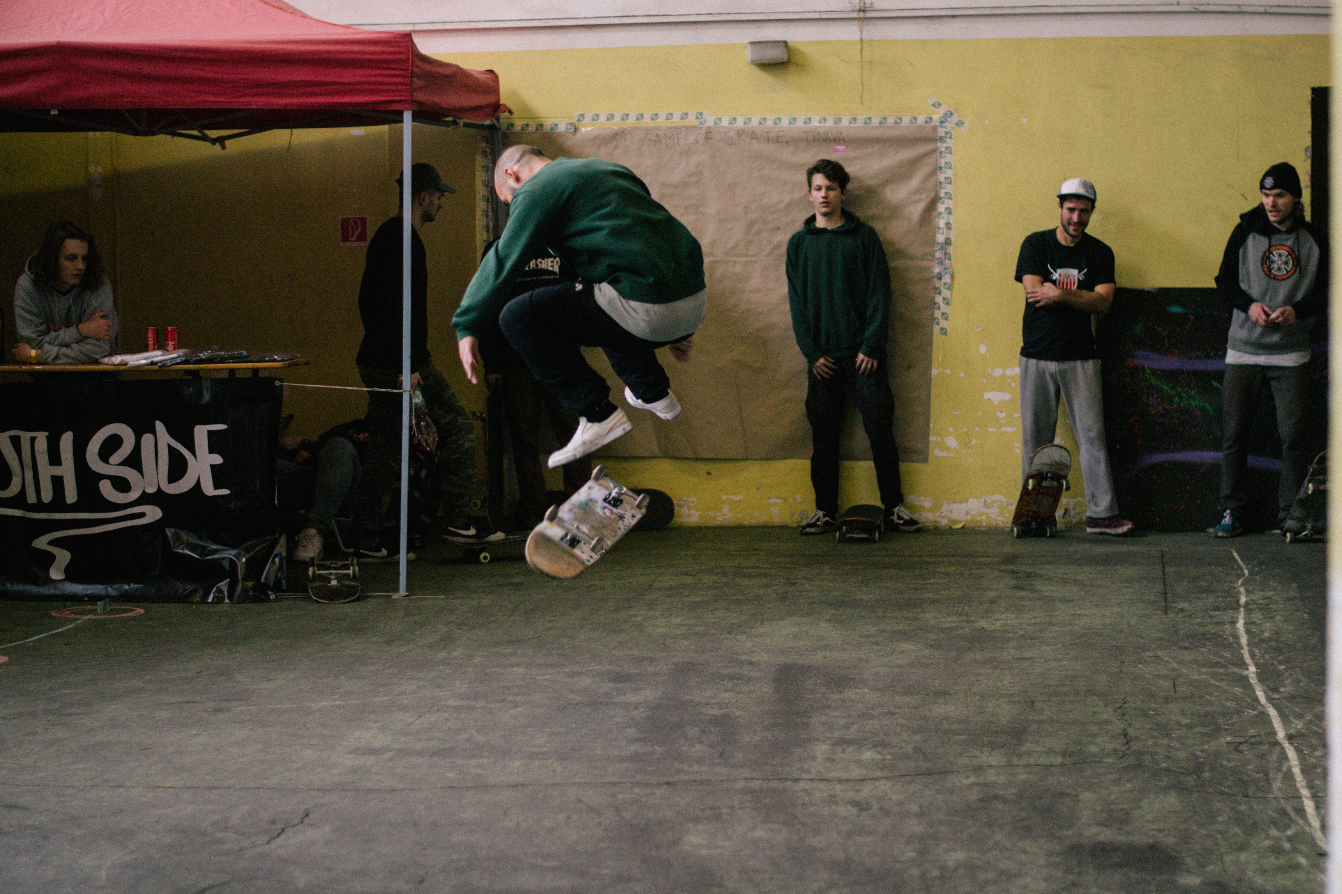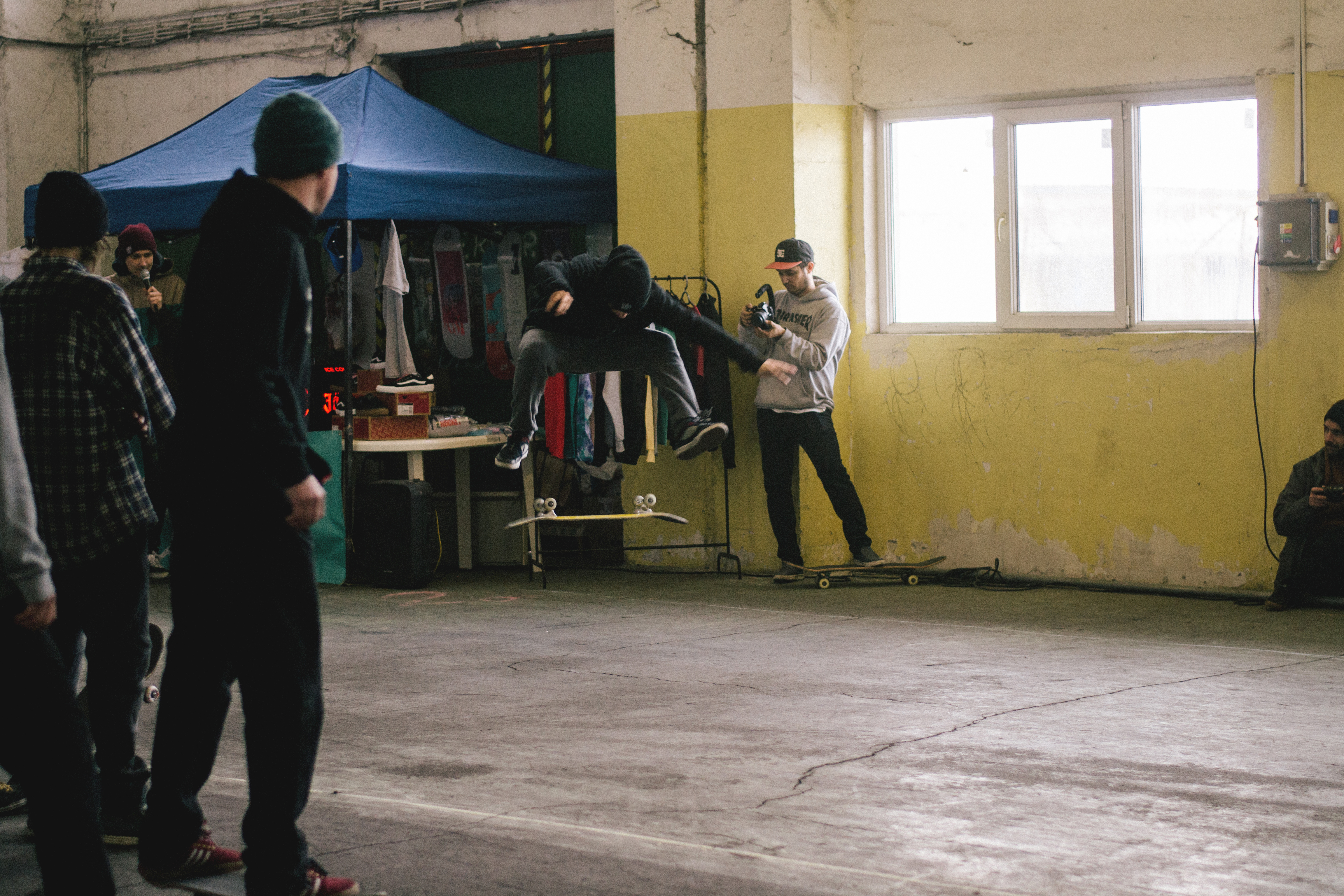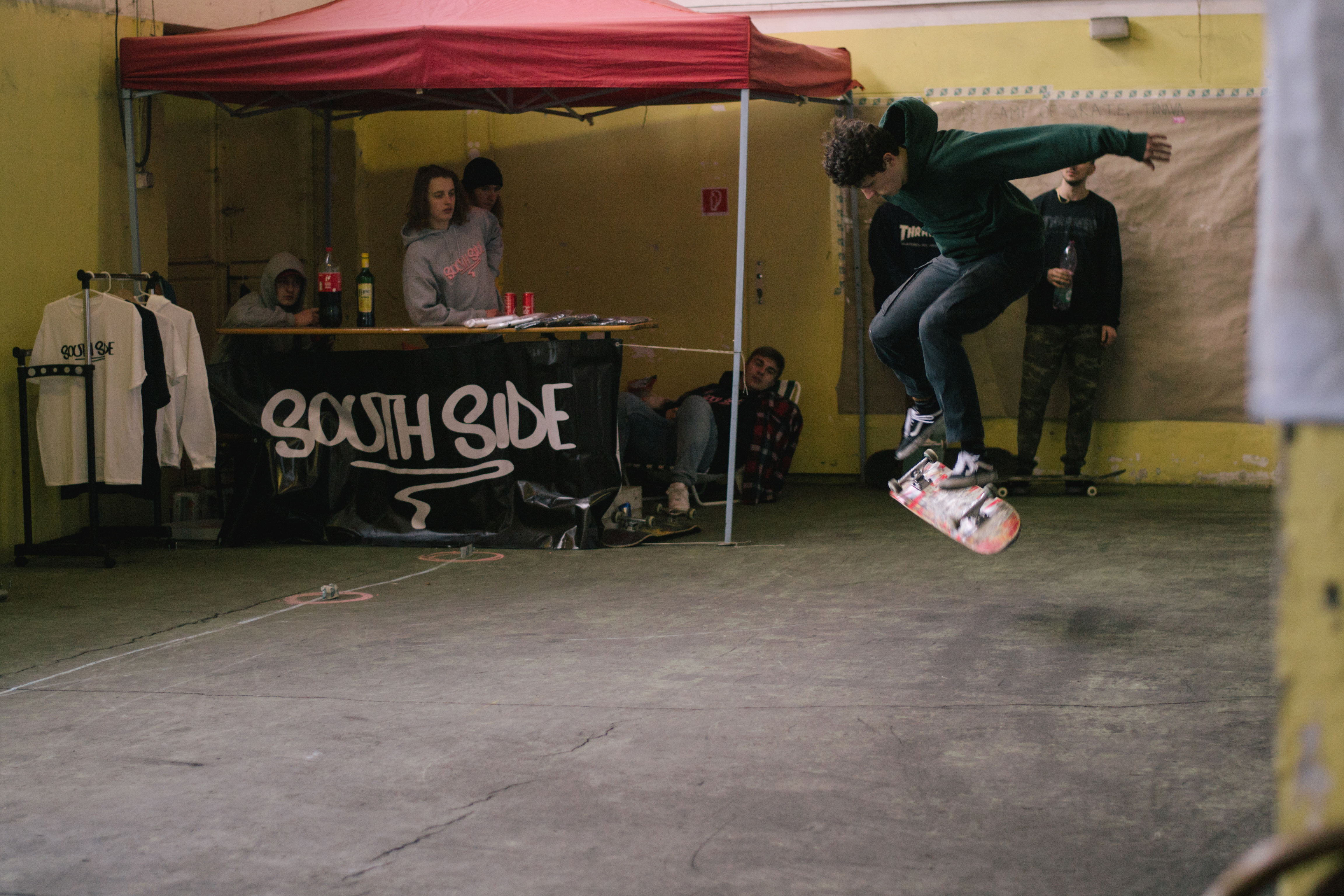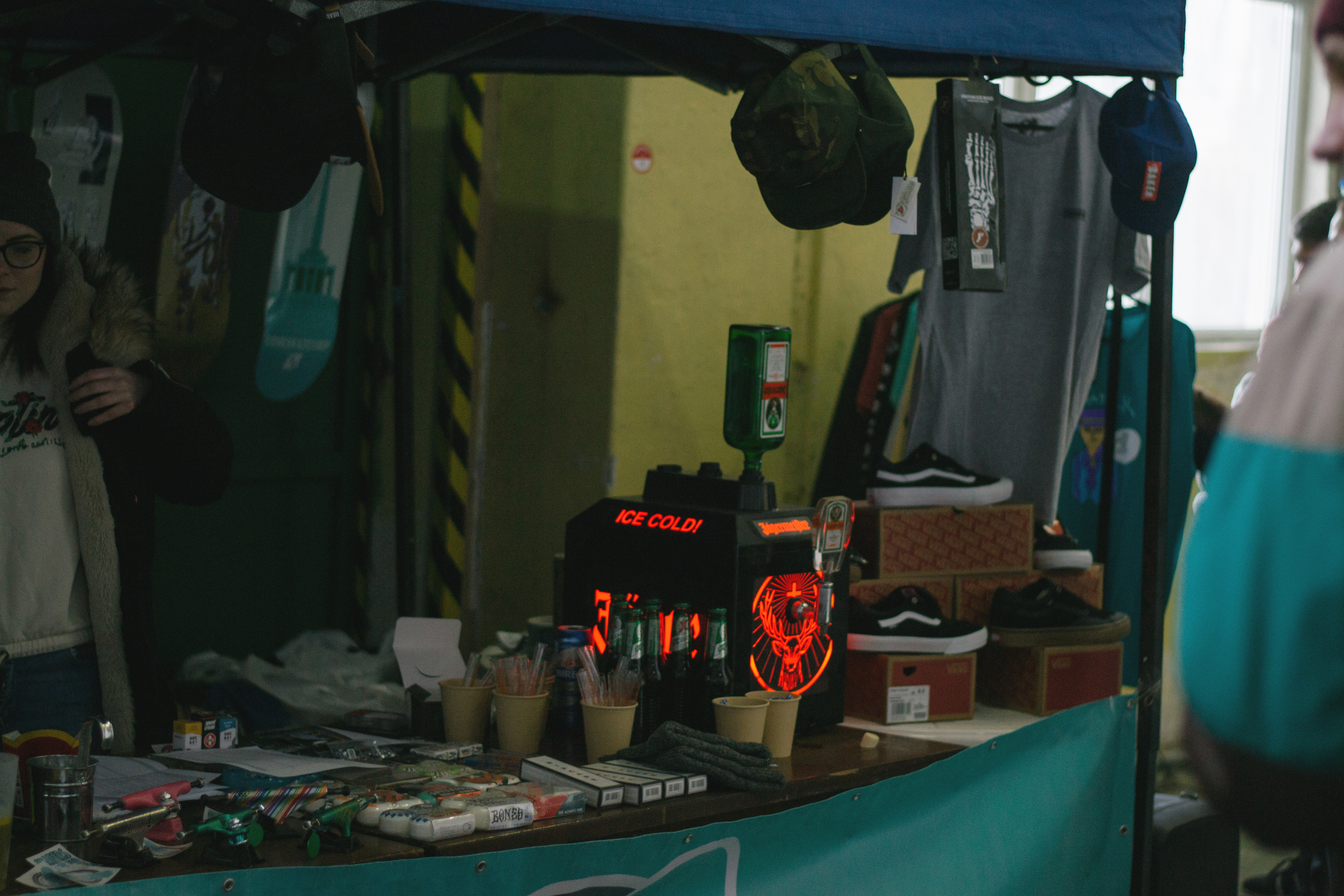 Naše dve spojky zo Sketonu, majstri betónu Braňo Moravčík a Rudko Rokošný, pre nás pripravili parádny priestor vedľa Herbert skladu. Povrch haly bol čierny od niekoľkoročného prachu, no náš hygienic manager-Rudko, sa postaral aby vaše zadky po pádoch boli čisté ako hlava Mr. Poppera. Chalani z Herbertu zo SouthSide a Cube postavili svoje stánky a dorazili rideri z celého Slovenska. Nemohli chýbať ani majstri tlaku z Košíc a technický killeri z Maďarska.