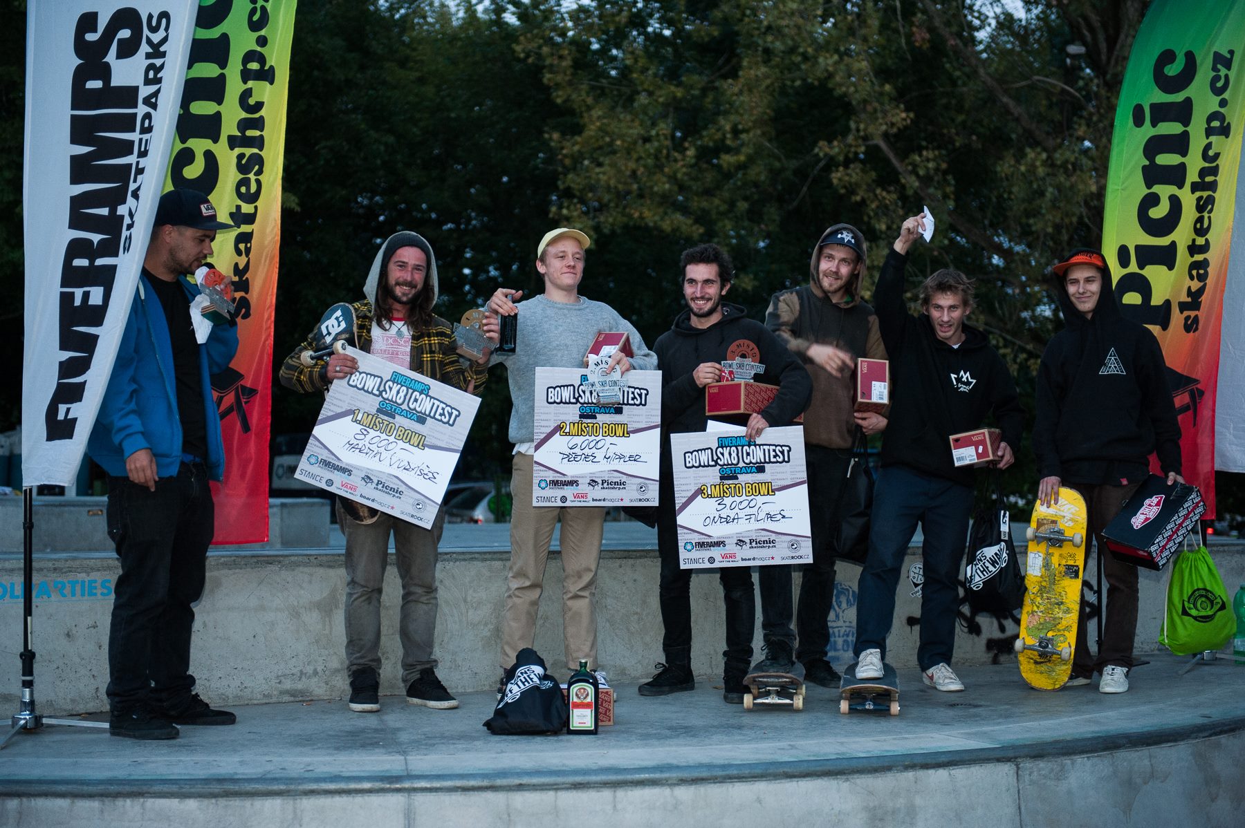 Vydáno: 26.09.2016Včera, tedy poslední víkend v září, se odjel velký Fiveramps Bowl Sk8 Contest v ostravské plaze. Vše bylo směrováno do bazénů, ale nechyběl ani nedělní best trick contest s penězi rovnou do ruky. Bylo rozhodně na co koukat. Po dvou nabitých dnech si vybojoval vítězství Martin Jurášek, za ním skončil zabiják Přemek Hippler a na třetím místě Ondřej Filípek. Report ze závodu je v řešení.