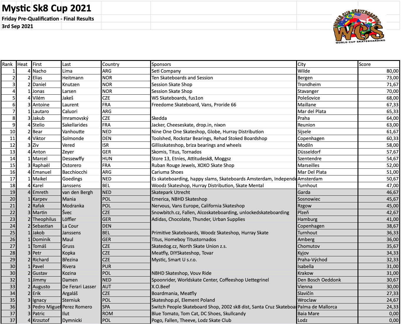 Hlavním hrdinou byl stoprocentně argentinec Nacho Lima, který postoupil z prvního místa a jeho flip bs lipslide všude zdvihal na tribuně snad všechny fanoušky, kteří dorazili podpořit tenhle event a zafandit skvělýmu skateboardingu. Za zmínku stopro stojí postup dvou českých riderů, Viléma Jakeše, který postoupil z pátého místa a Jakuba Imramovského, který postoupil z místa osmýho. Určitě všechny ještě zaujal dánskej prcek Viktor Solmonde, kterej obalenej chráničema lítal asi ze všech nejvíc.