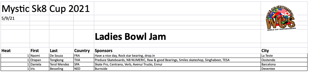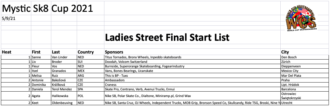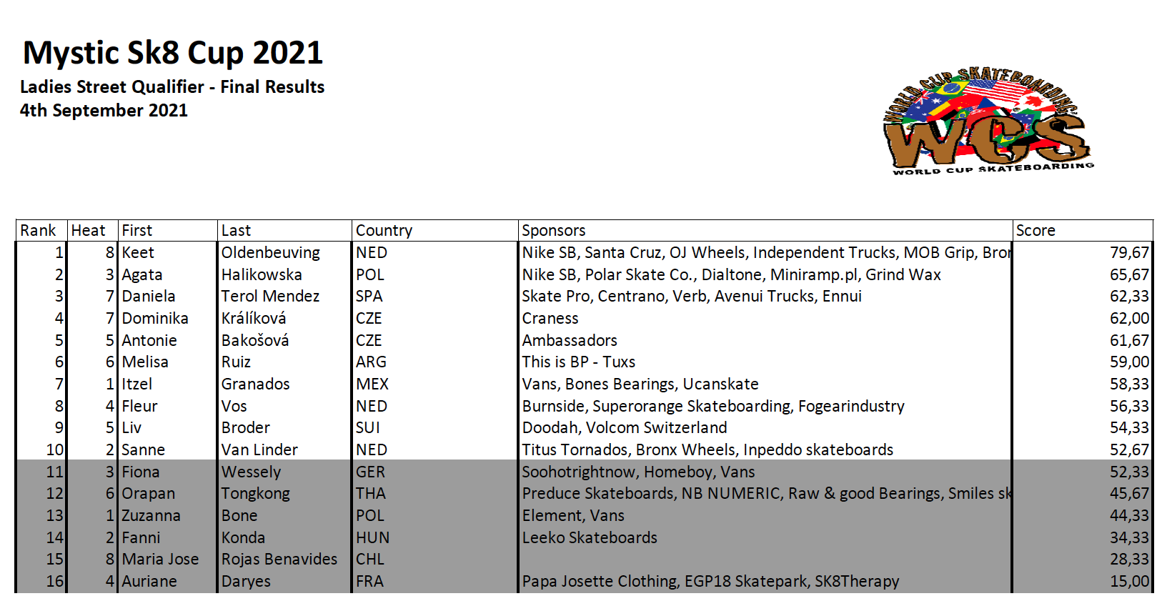 K vidění toho byla spousta a vypisovat všechny highlighty by zabralo celej den a x stránek. Po klučičí kvalde nastoupily do parku holky na svou kvalifikaci. Těch bylo celkem 14 a byly po dvou rozděleny do sedmi heatů, ve kterých jeli vždy po dvou společný jam. V téhle disciplíně jela hlavně Antonie Bakošová, který se zadařilo a zařídila si postup do nedělního závodu díky trikům jako boardslide na railu do kopce, bs grind na mramoru a bs 5-0 grind tamtéž. Za tohle si zasloužila páté místo. Další želízko v ohni byla slovenská riderka Dominika Králíková, která brala 4. místo za triky jako grind na mramoru, bs 180 ollie přes roh a bs flip přes roh. Hlavní jména byly Keet Oldenbeuving s borem na railu do kopce, halfcab noseslidem na railu na áčku nebo boardslidem shuvit out na rovným railu. Druhý místo si vyjela polka Agata Halikowska a třetí postupový flek brala Daniela Terol Mendez ze Španělska za boro na railu, ollie transfer, fs ollie z double setu nebo bs 5-0 grind přes díru.