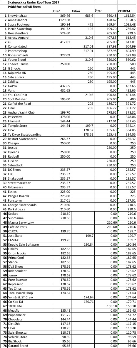 Sponzoring jezdce a práce firem pro jezdce, je nedílnou součástí skate scény a proto nám přijde fér ohodnomt i tuto pro diváka leckdy neviditelnou stránku skateboardingu. Po každém závodu tak vznikne aktulizovaná tabulka s přehledem firem, které stejně jako jezdci, budou dostávat počty bodů na základě umístění svých jezdců. Chceme tak lidem dát víc na vědomí existenci sponzorů, neb leckdy při závodu i přes snahu speakera, upadnou v zapomění. A samozřejmě budeme rádi když na účasti jezdce na závodech, bude mít zájem jak samotný rider, tak i jeho sponzor.