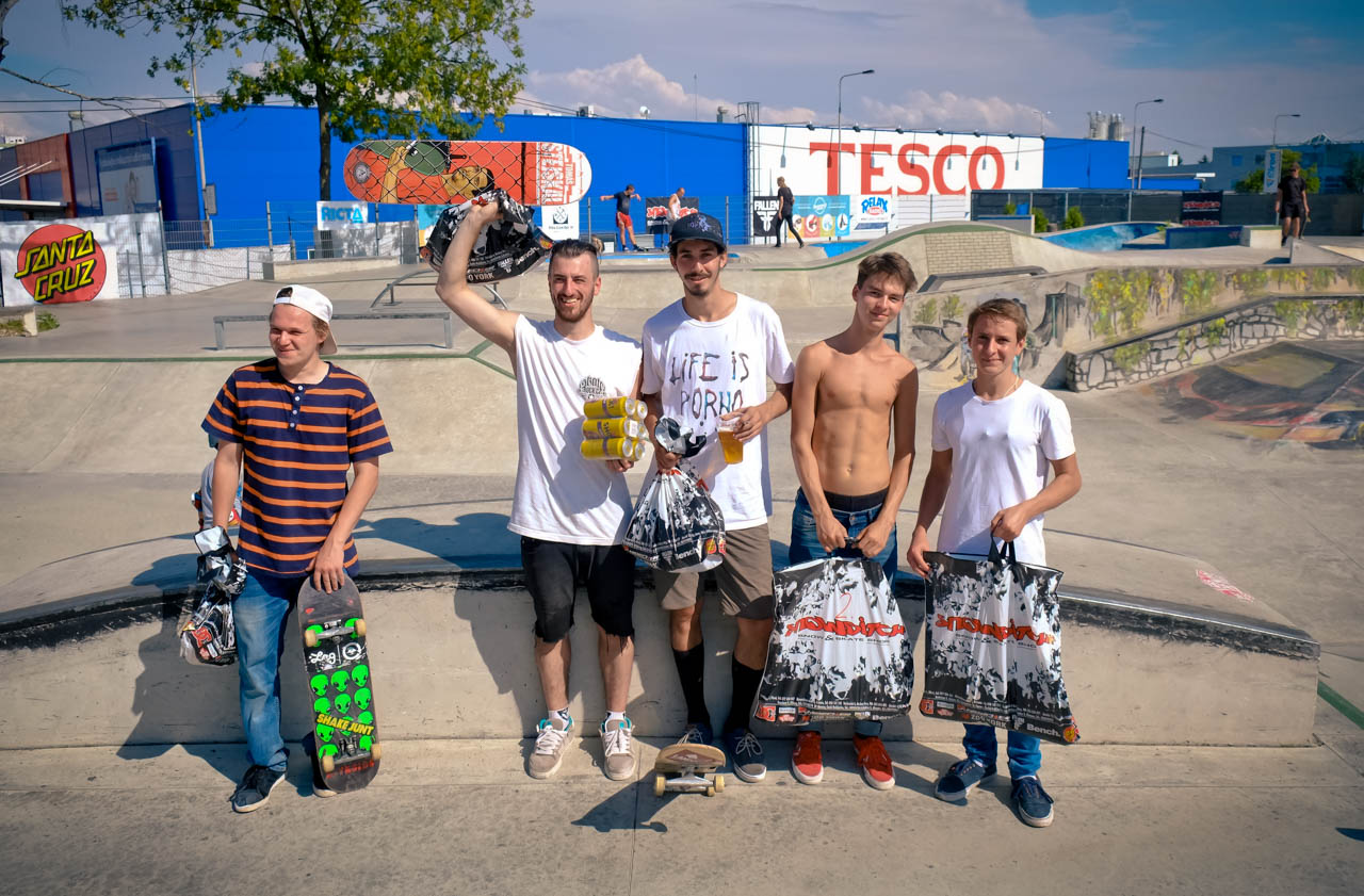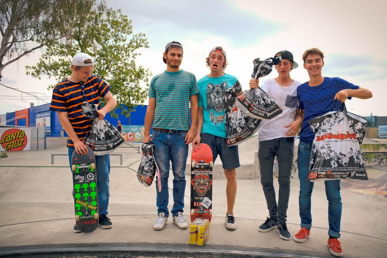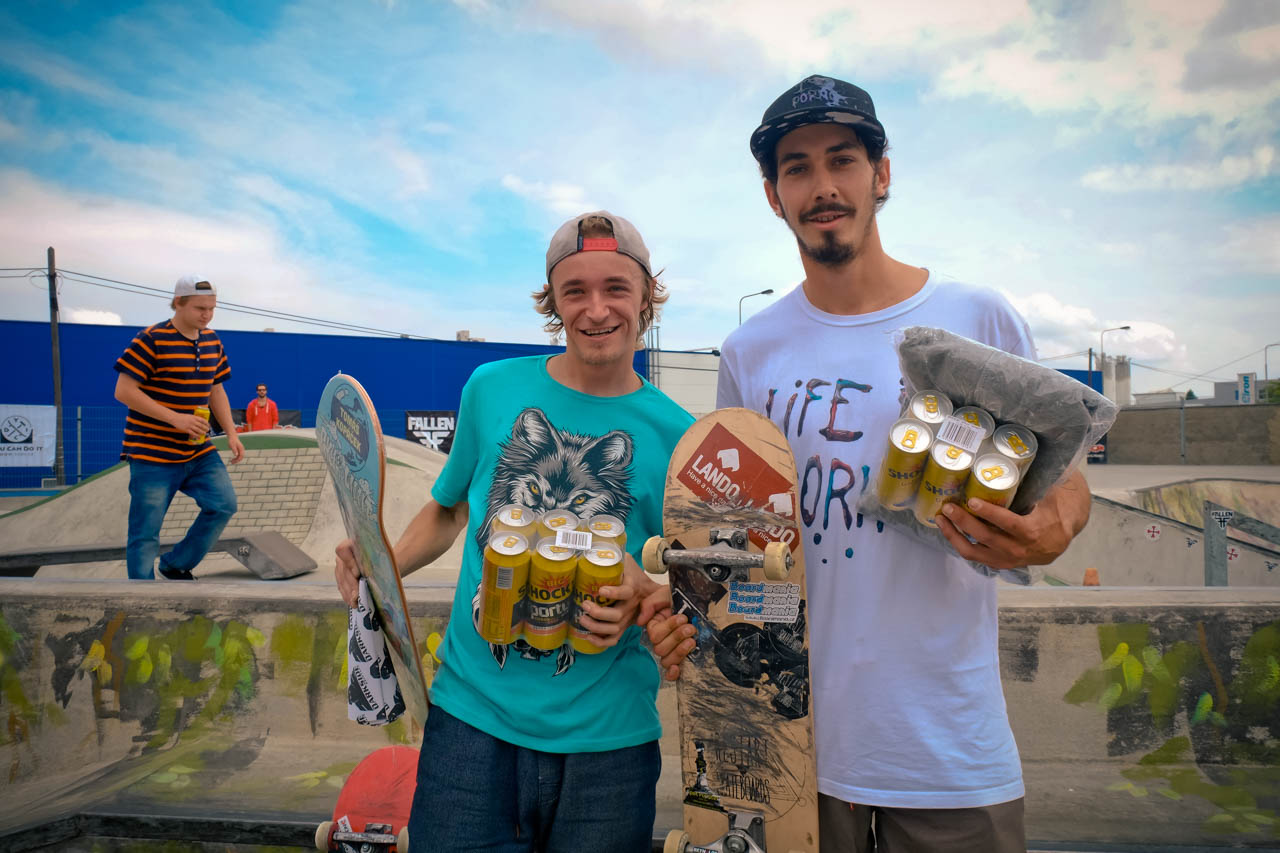 Další disciplínou byl ollie contest přes laťku, kde si to ve vyhroceným finále rozdali Fořtik s Raichelem, Nakonec bral novou lasničku Pavlik se svým ollie 80cm. DJ Vánis a Satý vyhrávaj punkový pecky, pivko teče proudem a my pokračujem jamem v sekci: duha, šikmá kulatina, rovná hranatina, grinbox a gap přes kočičáky. Tohle dobou už jsou tu všichni a tahle půlhodinka je fakt peklo. Rozhodčí nevědi kam koukat dřív, rideři si skáčou po hlavách a šlapou do toho na plný koule. Za tenhle jam všem fakt respekt! První flek bere fotograf a rider v jedné osobě CJ. Zabije jako málokdo total všechny překážky, včetně duhy z rádiusový strany. Druhý je Ryan např. s jeho fs bluntem ze šikmý a třetí Karel, který sice dává pekla dne, jako varo do gráče na rovný, double flip fs bor a flip fs blunt tamtéž, leč ostatní překážky nechává ležet ladem, takže tak...