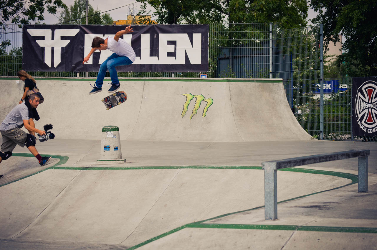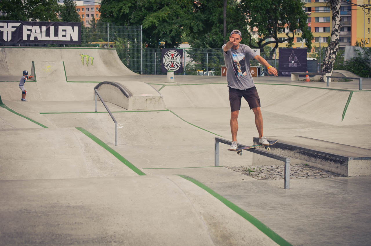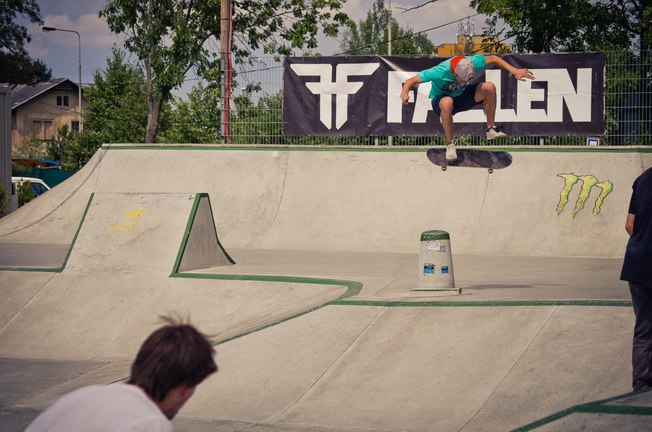 Další disciplínou byl ollie contest přes laťku, kde si to ve vyhroceným finále rozdali Fořtik s Raichelem, Nakonec bral novou lasničku Pavlik se svým ollie 80cm. DJ Vánis a Satý vyhrávaj punkový pecky, pivko teče proudem a my pokračujem jamem v sekci: duha, šikmá kulatina, rovná hranatina, grinbox a gap přes kočičáky. Tohle dobou už jsou tu všichni a tahle půlhodinka je fakt peklo. Rozhodčí nevědi kam koukat dřív, rideři si skáčou po hlavách a šlapou do toho na plný koule. Za tenhle jam všem fakt respekt! První flek bere fotograf a rider v jedné osobě CJ. Zabije jako málokdo total všechny překážky, včetně duhy z rádiusový strany. Druhý je Ryan např. s jeho fs bluntem ze šikmý a třetí Karel, který sice dává pekla dne, jako varo do gráče na rovný, double flip fs bor a flip fs blunt tamtéž, leč ostatní překážky nechává ležet ladem, takže tak...