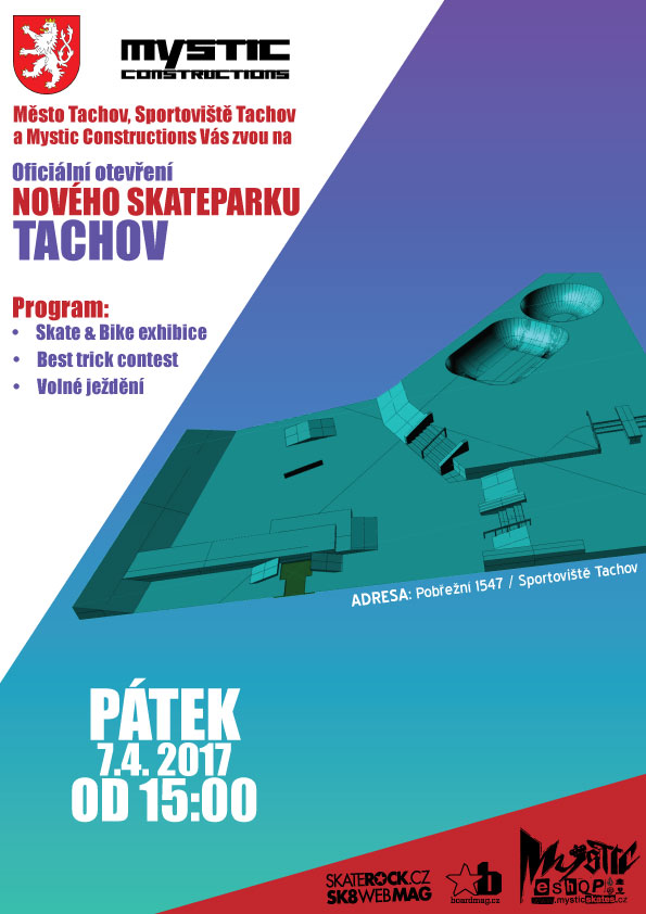 Město Tachov, Sportoviště Tachov a Mystic Constructions Vás zvou na oficiální otevření nového skateparku v Tachově v pátek 7.4. 2017.